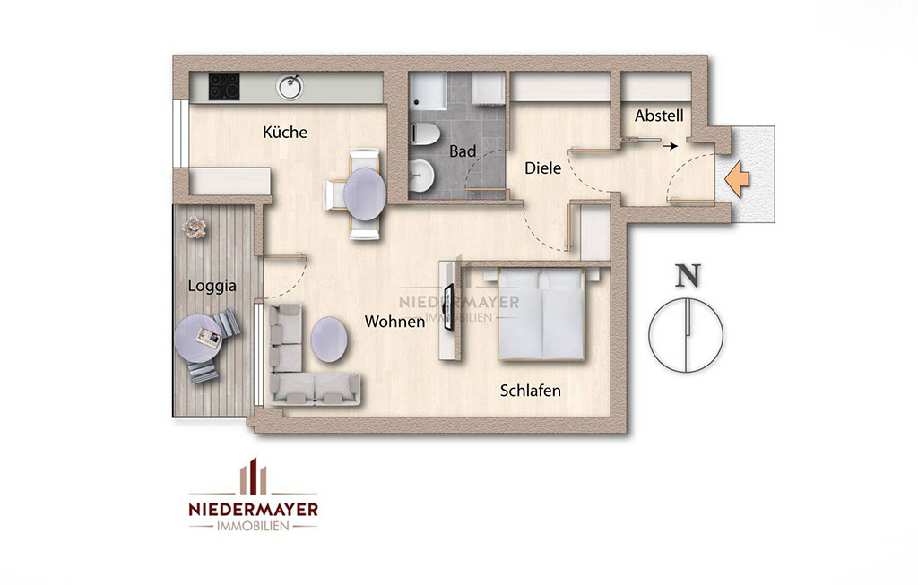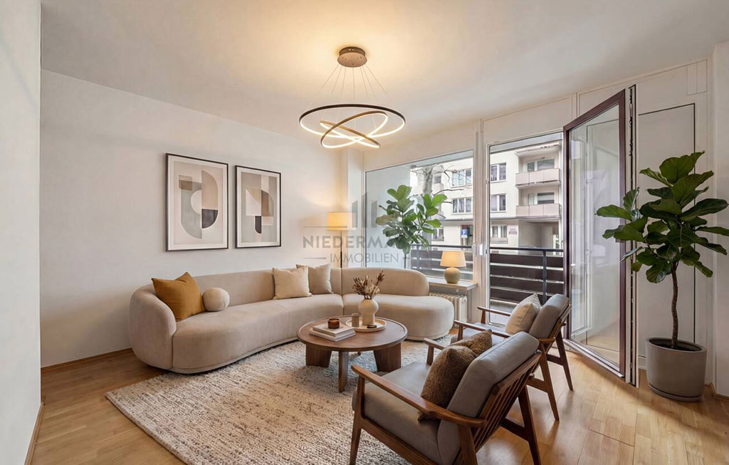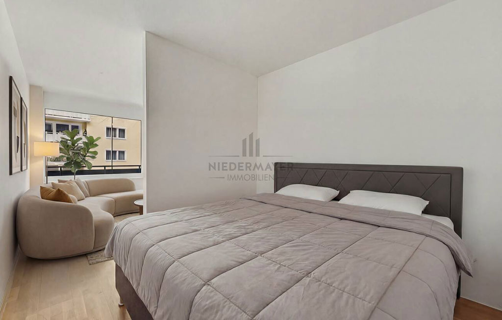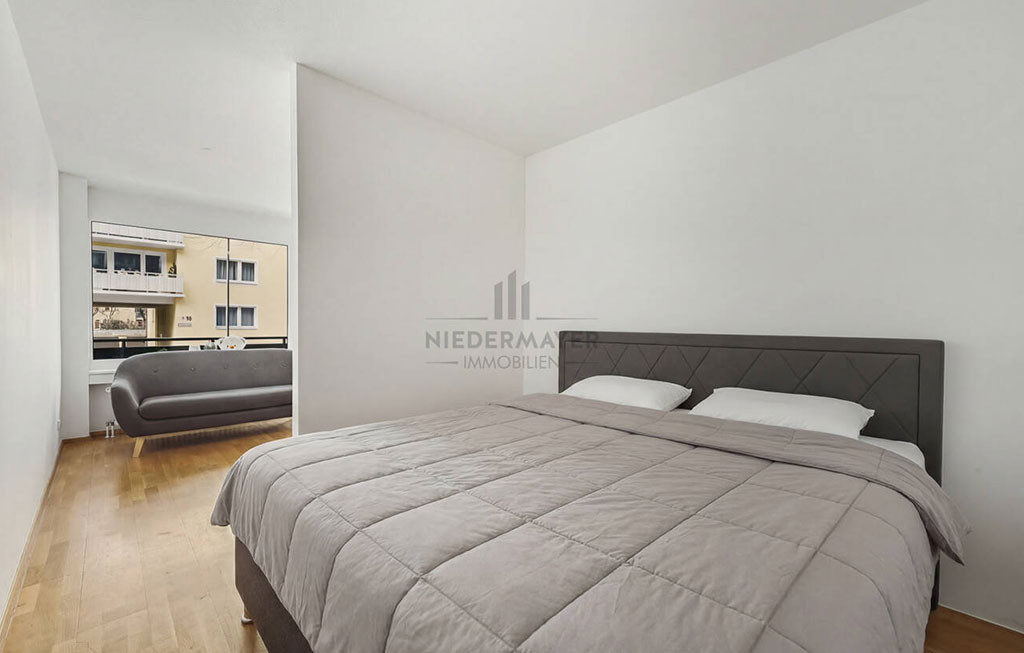 Das Herzstück der Wohnung bildet das großzügige Wohnzimmer mit ausreichend Platz für eine komfortable Wohnlandschaft und einen Essbereich. Von hier aus gelangen Sie auf die sonnige Loggia mit Westausrichtung – ein idealer Ort, um den Tag entspannt ausklingen zu lassen. Das Schlafzimmer lässt sich als ruhiger Rückzugsort individuell gestalten. Die offene Küche überzeugt durch eine großzügige Arbeitsfläche, viel Stauraum und optimale Voraussetzungen für kulinarische Genüsse.