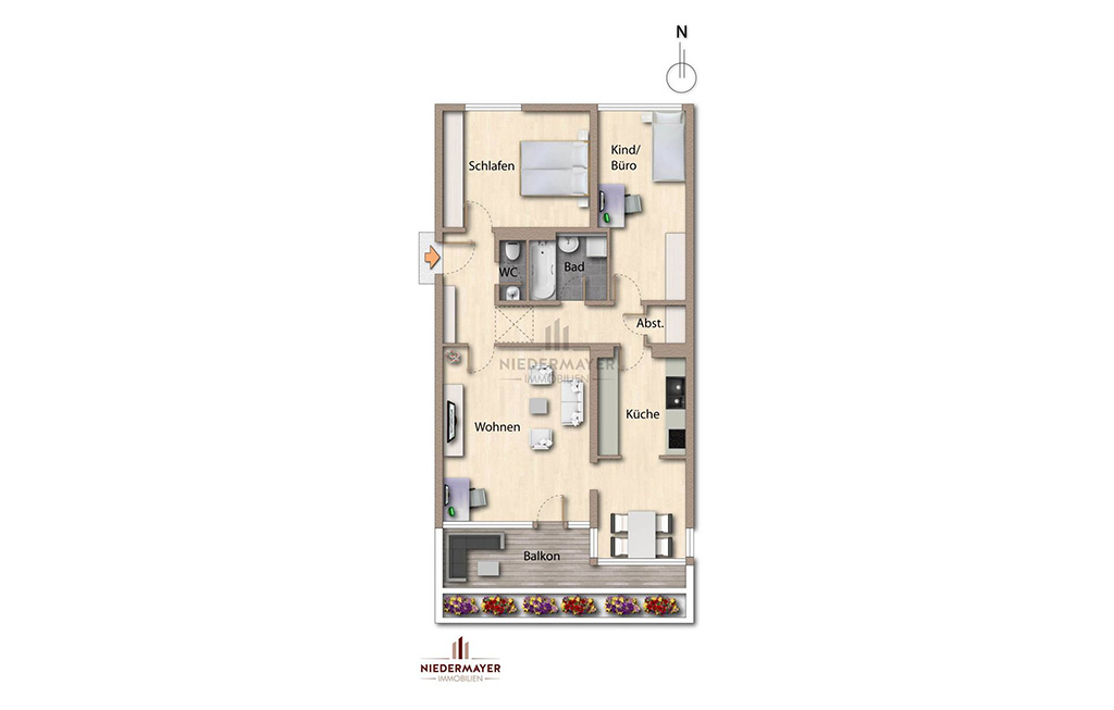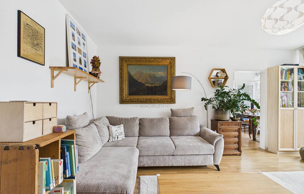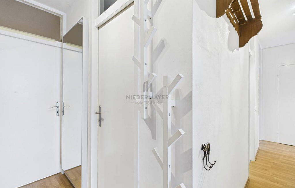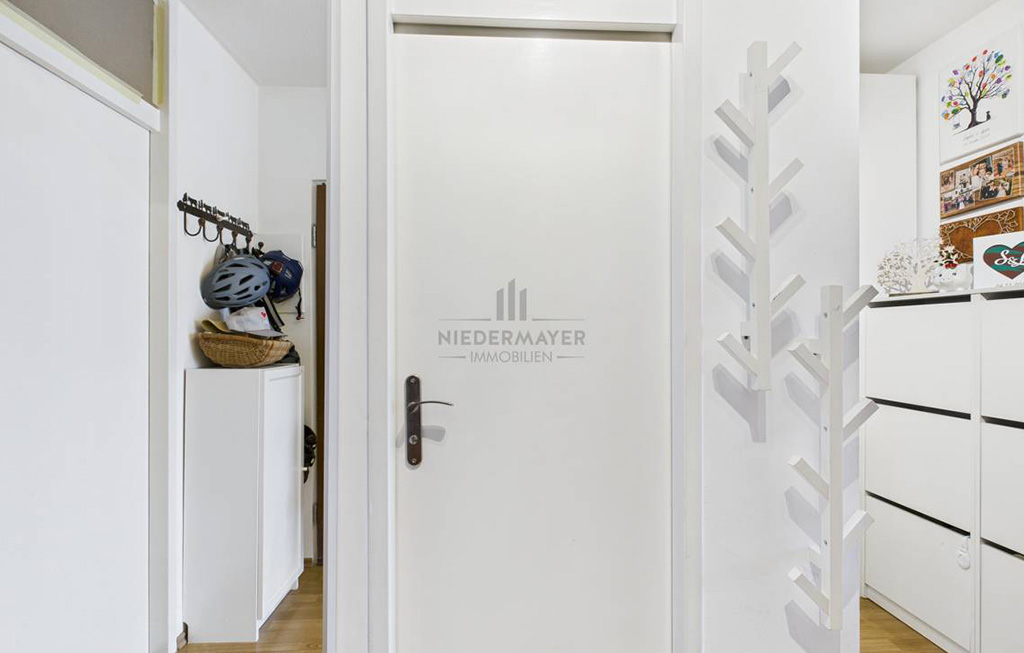 Beim Betreten der Wohnung empfängt Sie ein L-förmiger Flur. Von hier aus haben Sie Zugang zu allen Zimmern. Der lichtdurchflutete Wohnraum bietet genügend Platz, um dort neben einer großzügigen Wohnlandschaft auch Ihr Home-Office zu integrieren. Sollte die Kinderplanung noch ausstehen, eignet sich das dritte Zimmer hervorragend als Büro.