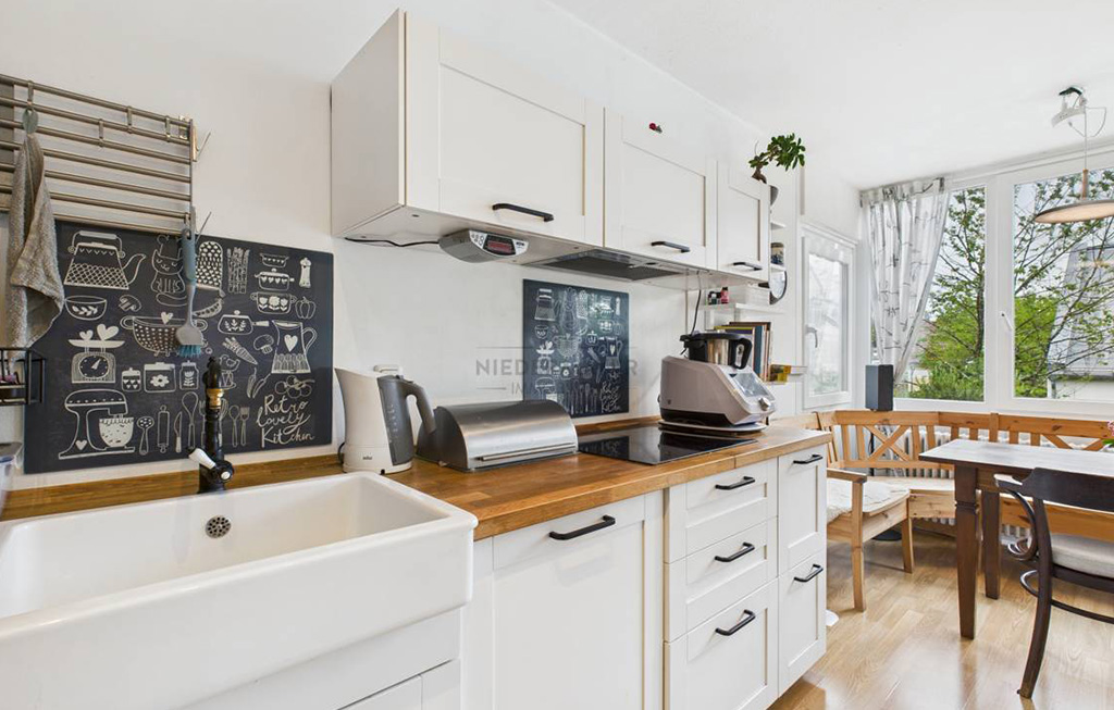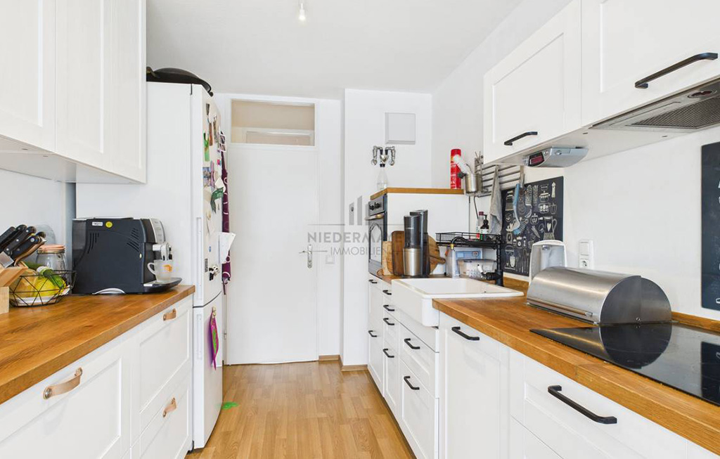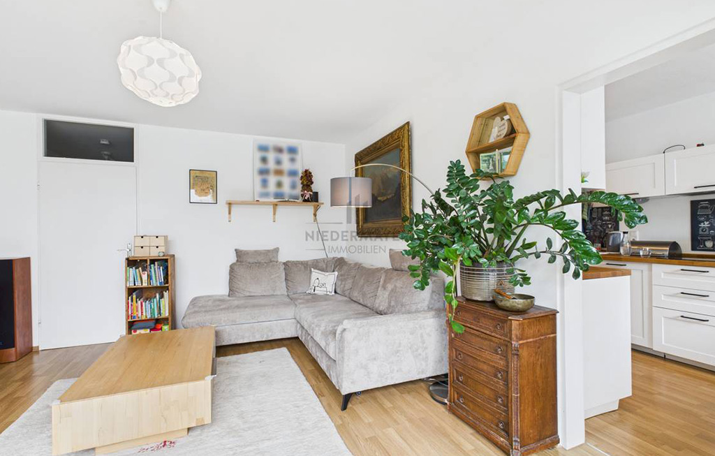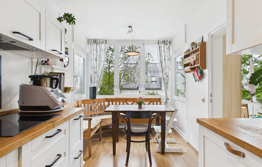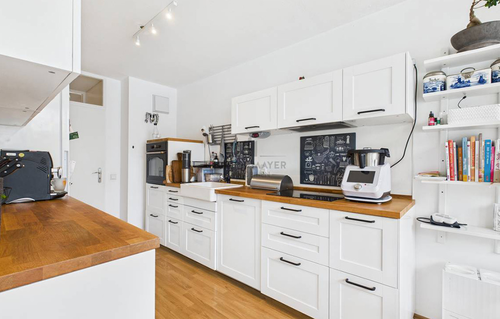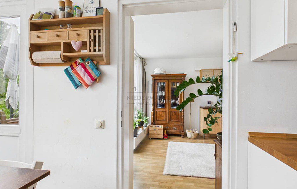 Zugang zur großen und sonnigen Süd-Terrasse haben Sie über das Wohnzimmer. Hier können Sie entspannen und den Ausblick genießen. Einfach perfekt für laue Sommerabende. Die Küche wurde klassisch separiert und bietet als Wohnküche genug Platz für eine gemütliche Essecke, um gemeinsame Mahlzeiten zu genießen und den Abend entspannt ausklingen zu lassen. Die Küche können Sie ganz nach Ihren Wünschen gestalten.