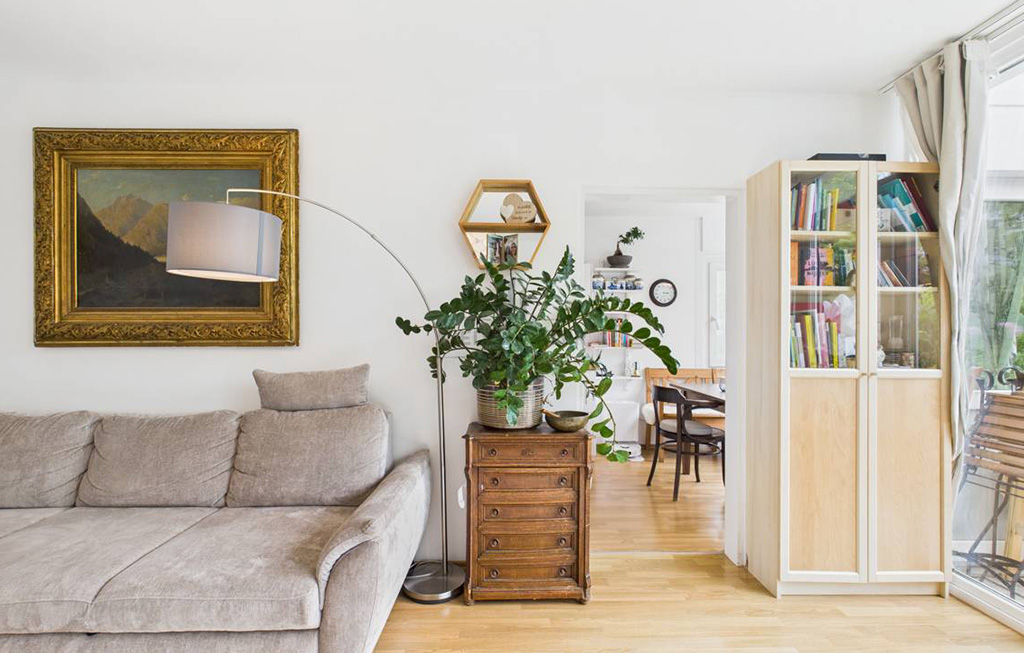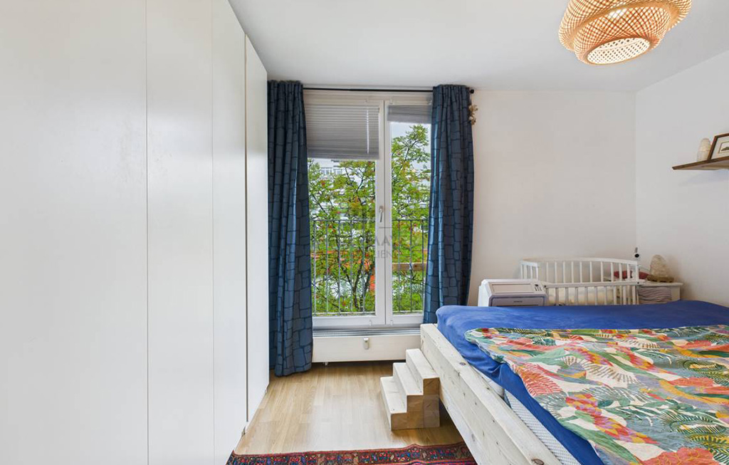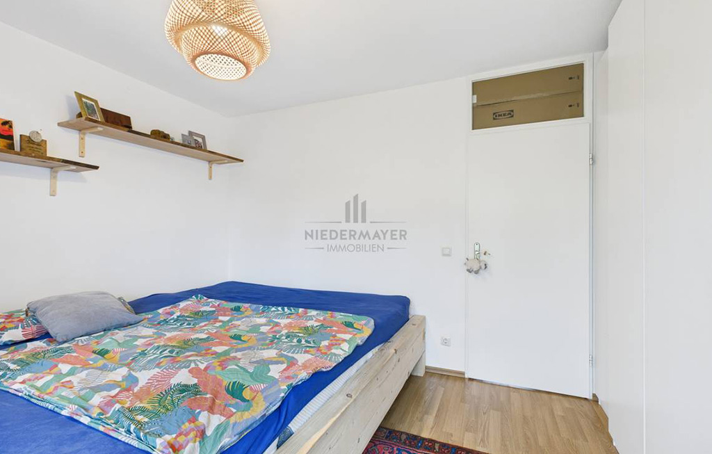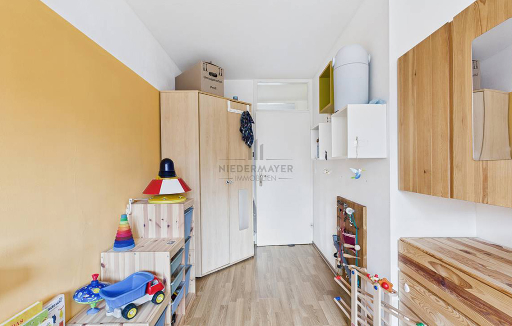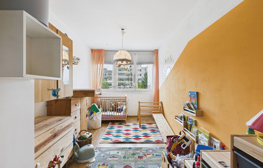 Gegenüber befindet sich ein weiteres Zimmer, das sich hervorragend als Home-Office, Gäste-/ oder Kinderzimmer eignet. Das Bad ist mit einem Waschbecken, einer Badewanne sowie einem Waschmaschinenanschluss ausgestattet. Das WC wurde separiert. Das Schlafzimmer ist großzügig gestaltet, damit neben einem Doppelbett auch ein großer Kleiderschrank Platz hat.